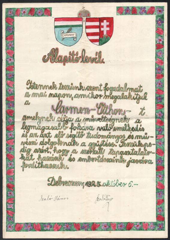 1925 Debrecen, a Carmen-Otthon alapító levele, Szabó Imre (Exodus) aláírásával