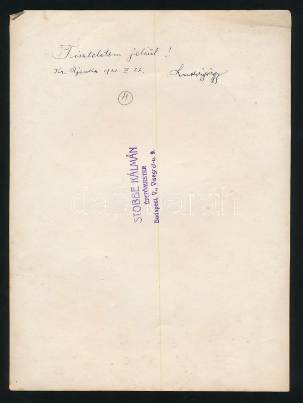 Description: 1920 Ludvig György a Krasznaja Recska, Rjecska, Krasnaia- Rjetschka (Habarovszk, Khabarovsk); hadifogolytáborban. Dedikált fotó Hátoldalán Stobbe Kálmán (1883-1936) építőmester, labdarúgó, a magyar válogatott edzője pecsétjével 16x22 cm /