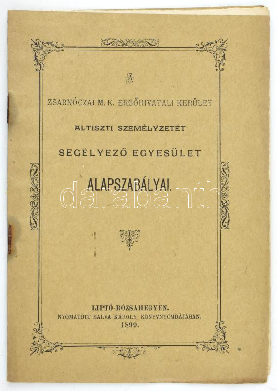1899 Zsarnóczai M. K. Erdőhivatali Kerület altiszti személyzetét segél... https://www.darabanth.com/en/488-Online-auction/488.0/Art-and-other-collectibles/Printed-Materials~1000014/1899-Zsarnoczai-M-K-Erdohivatali-Kerulet-altiszti-szemelyzetet-segelyezo-egyesulet-alapsza~II3343552