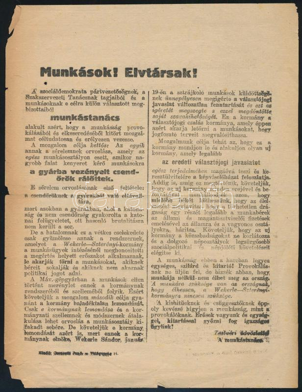 cca 1930 A Munkástanács által kiadott röplap, szakadásokkal