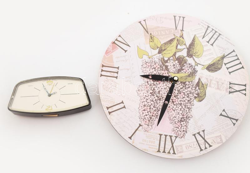 Slava szovjet 11 köves mechanikus vekkeróra, 15x7 cm + Modern design falióra, elem nélkül, d: 29 cm