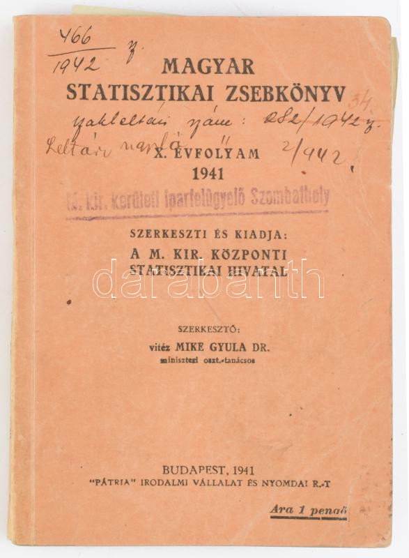 1941 Magyar Statisztikai Zsebkönyv. X. évfolyam. Szerk.: vitéz Mike Gy... https://www.darabanth.com/en/488-Online-auction/488.0/Books/Books-History~1000019/1941-Magyar-Statisztikai-Zsebkonyv-X-evfolyam-Szerk-vitez-Mike-Gyula-dr-Bp-1941-M-Kir-~II3350784