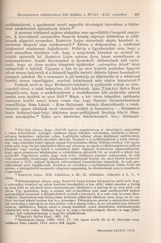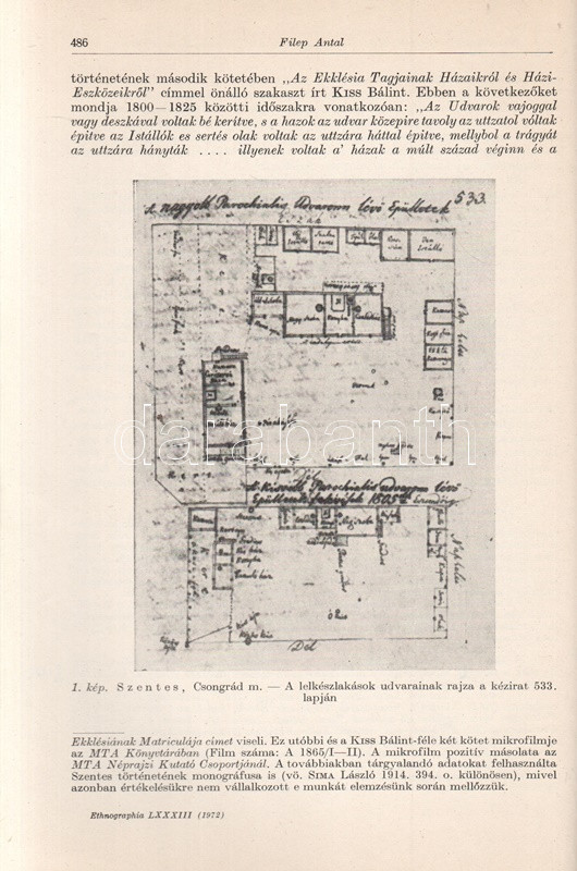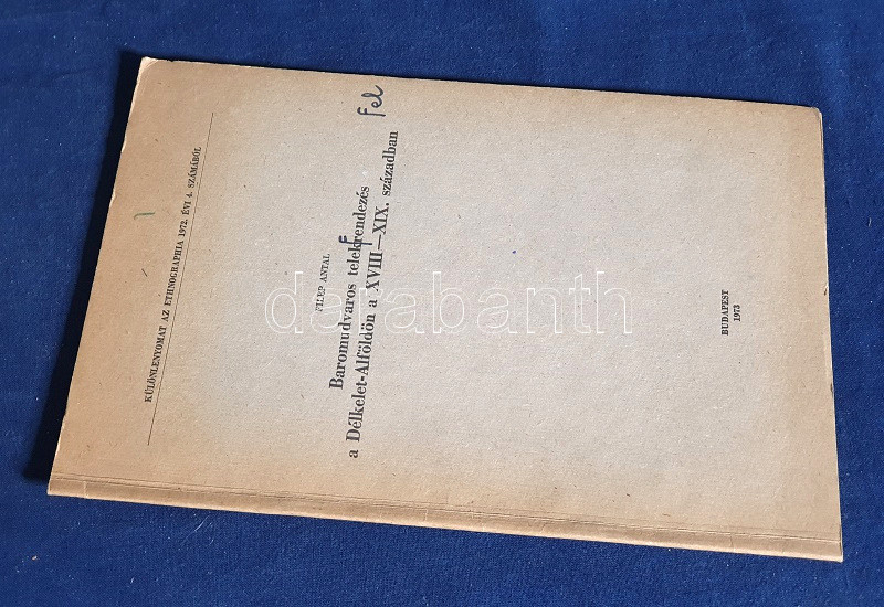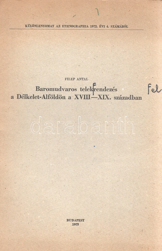 Filep Antal: Baromudvaros telekelrendezés a Délkelet-Alföldön a XVIII-XIX. században. (Dedikált.) Budapest, 1973. (Akadémiai Nyomda). [483]-506 p. Egyetlen kötetkiadás. Dedikált: "Major Jenőnek meleg baráti szeretettel: Tóni". Filep Antal (sz. 1936) néprajztudós népi építészeti tanulmányában szülővárosa, Szentes néhány XIX. század elején épített épületének példáján vizsgálja a baromudvaros telek-elrendezés tiszántúli gyakorlatát. (A baromudvaros telekelrendezés lényege, hogy a telek épületei - egyes gazdasági épületek kivételével - az utcafronttól távolabb helyezkednek el). Oldalszámozáson belül néhány archív alaprajzzal illusztrált. Az első borítón és a belív néhány oldalán ismeretlen kéztől (a possessortól?) származó korrektúrázások. (Különlenyomat az Ethnographia 1972. évi 4. számából.) Prov.: Major Jenő (1922-1988) településtörténész, földrajztudós, urbanisztikai szakíró. Fűzve, kiadói borítóban. Jó példány.