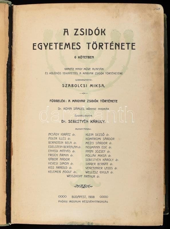 A zsidók egyetemes története 6 kötetben. Graetz nagy műve alapján és különös tekintettel a magyar zsidók történetére. Szerk.: Szabolcsi Miksa. A magyar zsidók történetére vonatkozó részeket összeáll.: Kohn Sámuel. V. köt.: Izrael népének története. Az általános üldözés századai. A kabala föltünésétől a spanyolországi száműzetésig (1230-1492). Függelékül: A magyar zsidók története a vegyes házból származó királyok alatt (1301-1526).. Bp., 1908, Phönix Irodalmi Rt., XVIII+(4)+622+(1) p. Szecessziós egészvászon-kötésben, viseltes borítóval, pótolt gerinccel, kisebb lapszéli ázásnyomokkal.