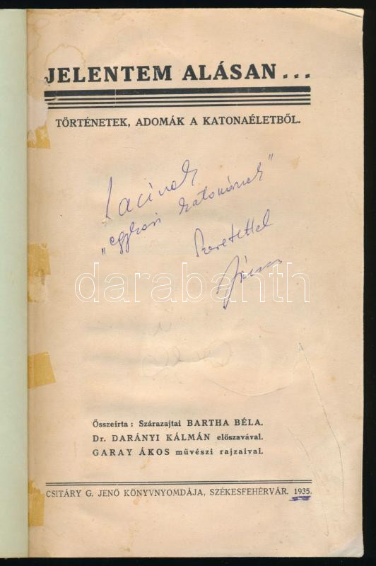 Bartha Béla, szárazajtai: Jelentem alásan... Történetek, adomák a katonaéletből. Darányi Kálmán előszavával. Garay Ákos művészi rajzaival. Székesfehérvár, 1935, szerzői kiadás (Csitáry G. Jenő-ny.), 142 p. Egyetlen kiadás. Átkötött félvászon-kötésben, kissé foltos, sérült címlappal, ajándékozási bejegyzéssel, az utolsó lap hiányzik.