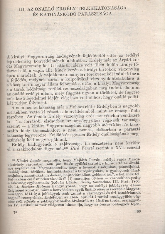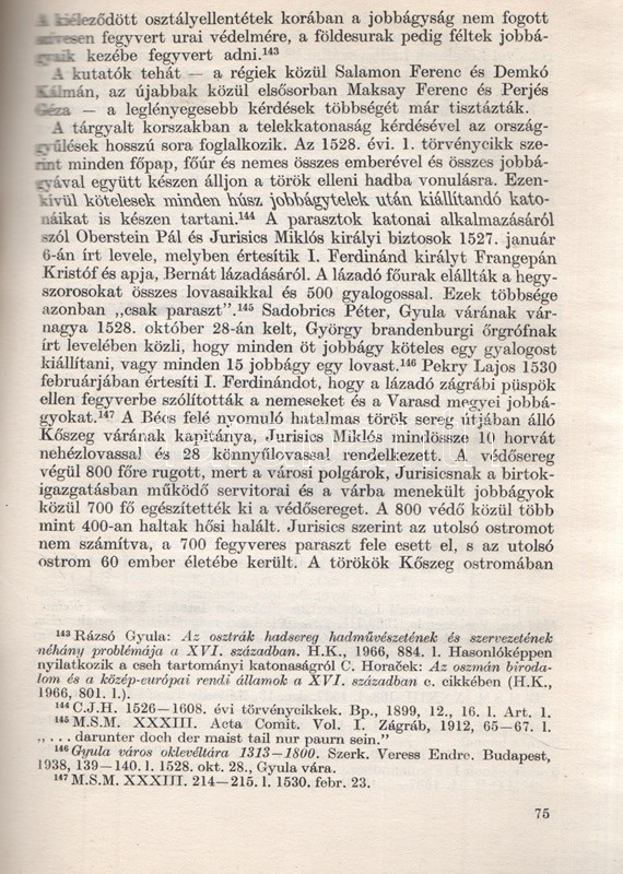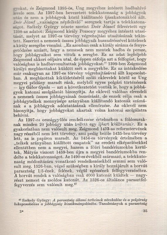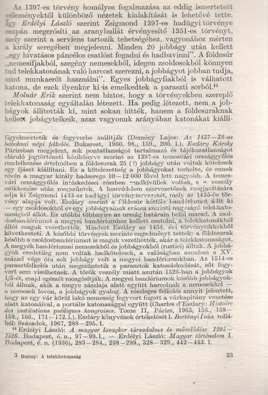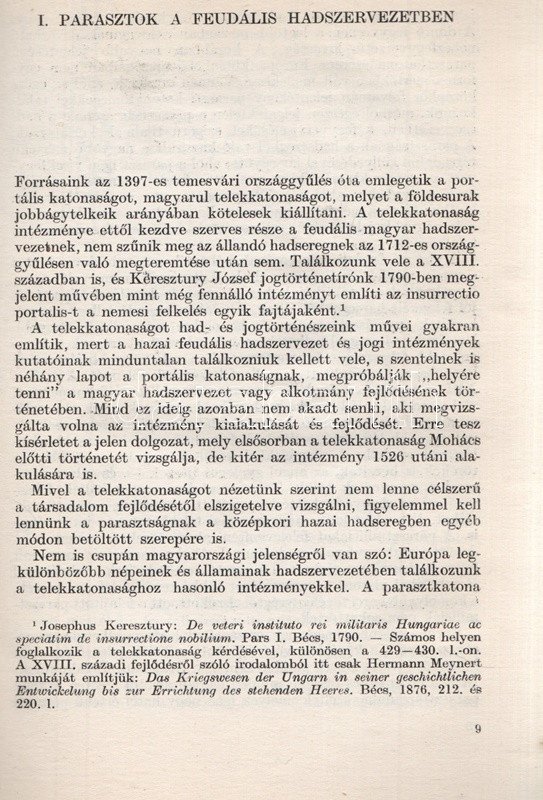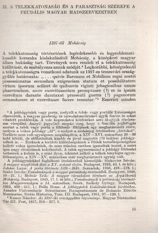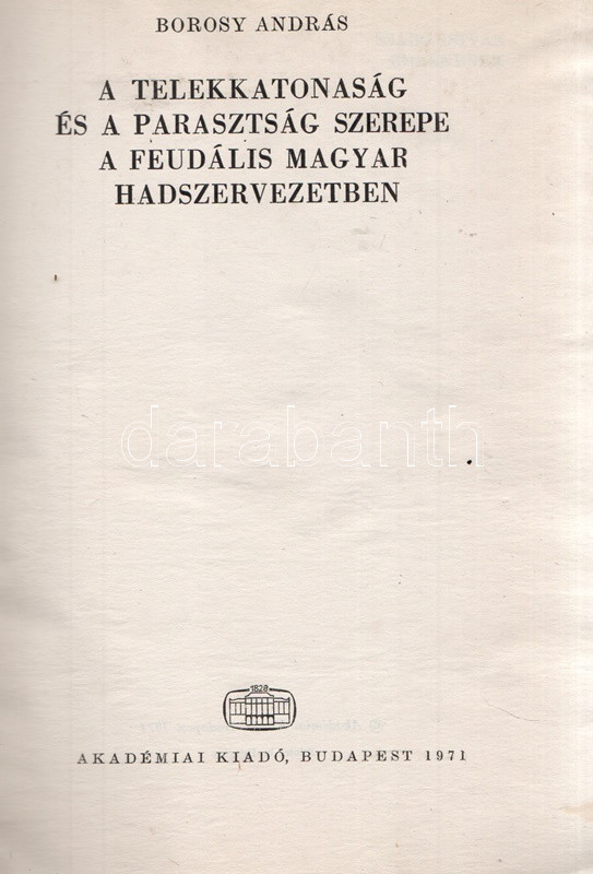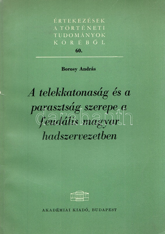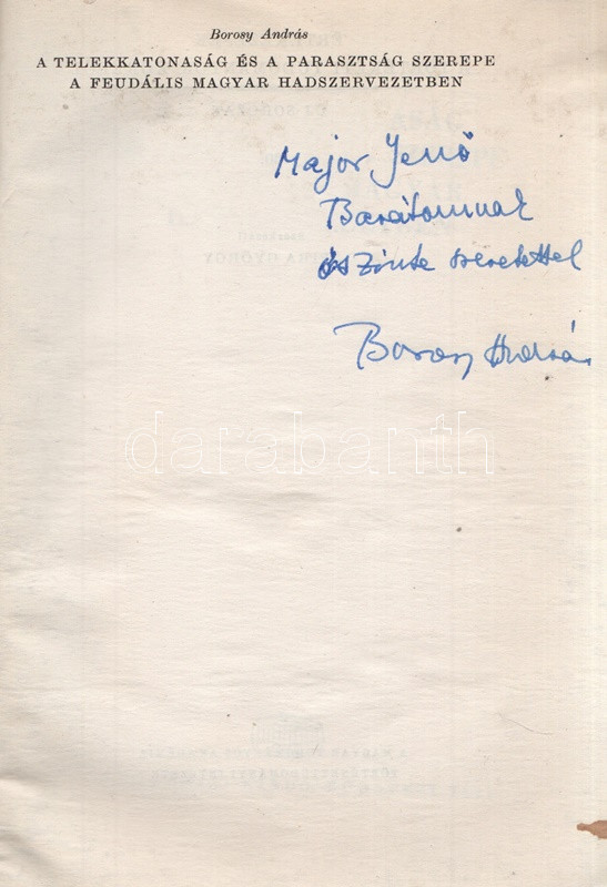 Dedikált: "Major Jenő barátomnak őszinte szeretettel: Borosy András." Borosy András (1922-2011) hadtörténész munkája a parasztság soraiból felállított haderő társadalomtörténetét vizsgálja az ezt szabályozó 1397. évi törvénykezéstől a török időkig. A szerző kutatásai szerint a közelgő török veszedelem miatt a XV. században épült ki a parasztság soraiból állított telekkatonaság, amely azonban mindvégig csupán kiegészítő szerepet vitt az ország védelmében.
