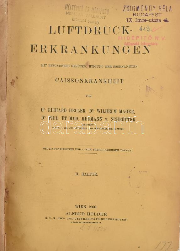 Heller, Richard - Mager, Wilhelm - Schrötter, Hermann von: Luftdruck-Erkrankungen mit besonderer Berücksichtigung der sogenannten Caissonkrankheit. II. Hälfte. Wien, 1900, Alfred Hölder, 1 sztl. lev.+ 625-1230 p.+ 2 (kihajtható) t.+ 9 (hártyapapírral védett) t. Német nyelven. Korabeli félvászon-kötésben, széteső, rossz állapotban, bélyegzésekkel, közte Zsigmondy Béla (1848-1916) gépészmérnök, kútfúró és hídépítő tulajdonosi bélyegzőjével.