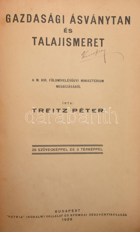 Treitz Péter: Gazdasági ásványtan és talajismeret. Bp., 1929,"Pátria", VIII + 237 p. +1 (Csonka-Magyarország kihajtható, színes talajtérképe) t. Gazdag szövegközti képanyaggal, térképekkel illusztrált. Átkötött félvászon-kötés, kissé kopott borítóval, két lap kijár (IV/V,VI/VII.)