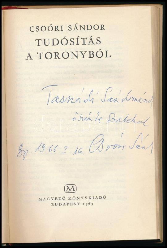 https://www.darabanth.com/en/488-Online-auction/488.0/Books/Books-Other-rarities~1000036/Csoori-Sandor-Tudositas-a-toronybol-DEDIKALT-Tasnadi-Sandornak-Bp-1963-Magveto-Kiad~II3351510