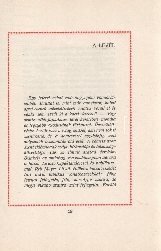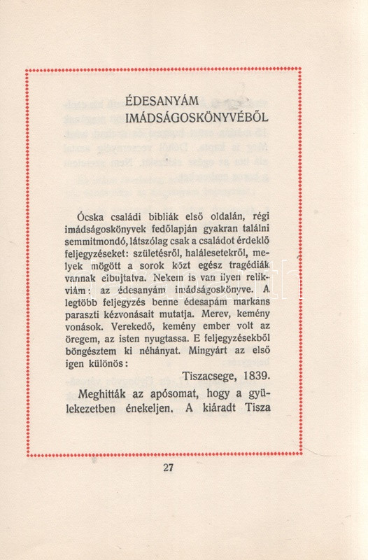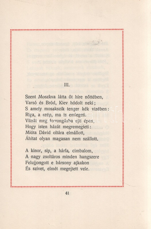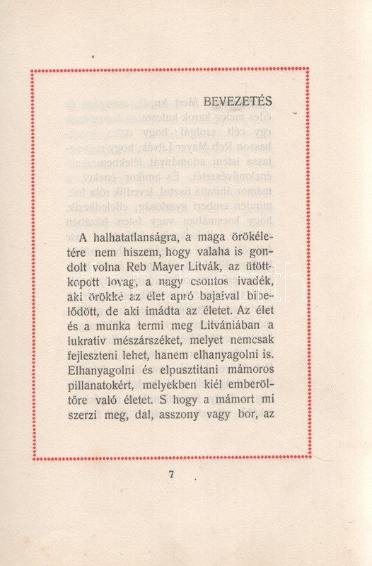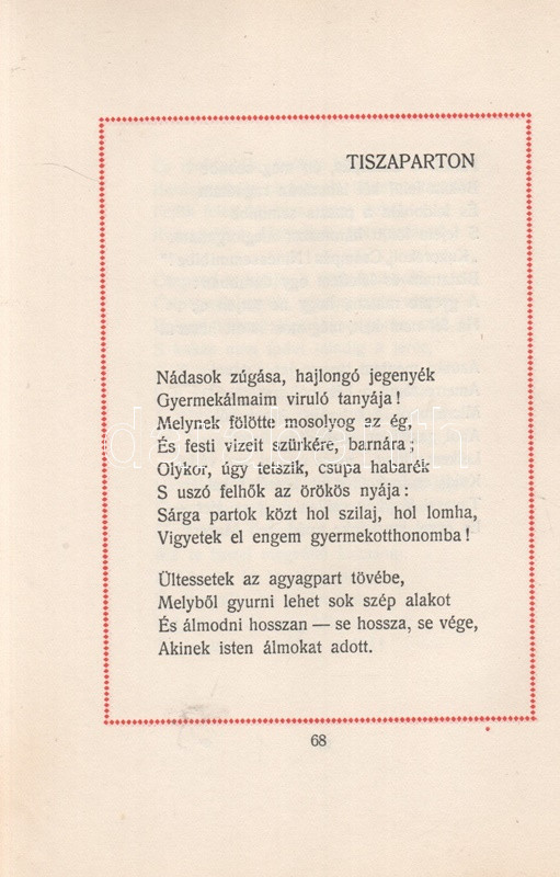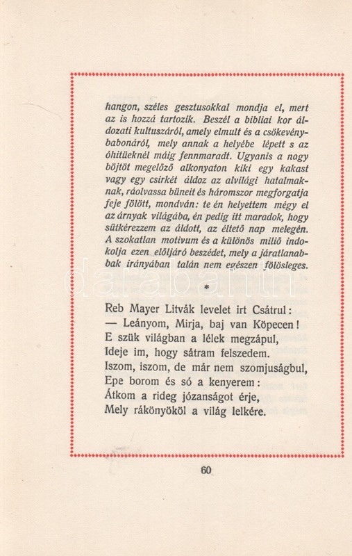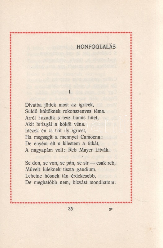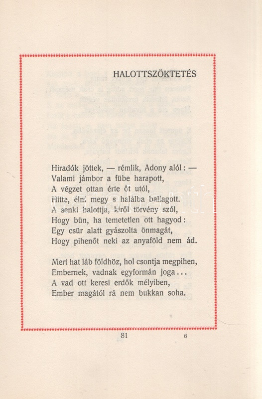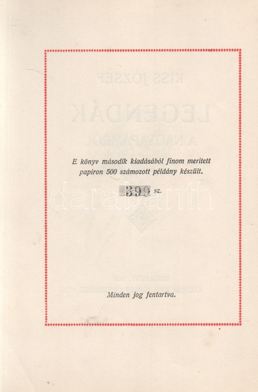 Kolofon: ,,E könyv második kiadásából finom merített papíron 500 számozott példány is készült. [Ez a] 399. sz[ámú példány]." Keretdíszes oldalakkal. Néhány oldalon apró foltosság, az első kötéstáblán régi tulajdonosi bejegyzés. Példányunk utolsó ívének négy levele kétszer szerepel, négy levele hiányzik.