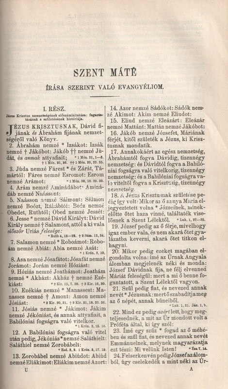 Szent Biblia, azaz Istennek Ó és Új Testamentomában foglaltatott egész Szent Írás. Magyar nyelvre fordította Károli Gáspár. Budapest, 1921. Brit és Külföldi Biblia-Társulat (Magvető-könyvnyomda). [4] + 908 p.; 306 + [8] p. + 4 térkép (színes). Kéthasábos szövegoldalakkal. Az Újszövetség könyvei után bibliai térképek, illetve a családi bejegyzésekre szolgáló oldalak. Aranyozott gerincű, vaknyomásos, enyhén kopott kiadói félvászon kötésben, márványmintás festésű lapszélekkel. Jó példány.