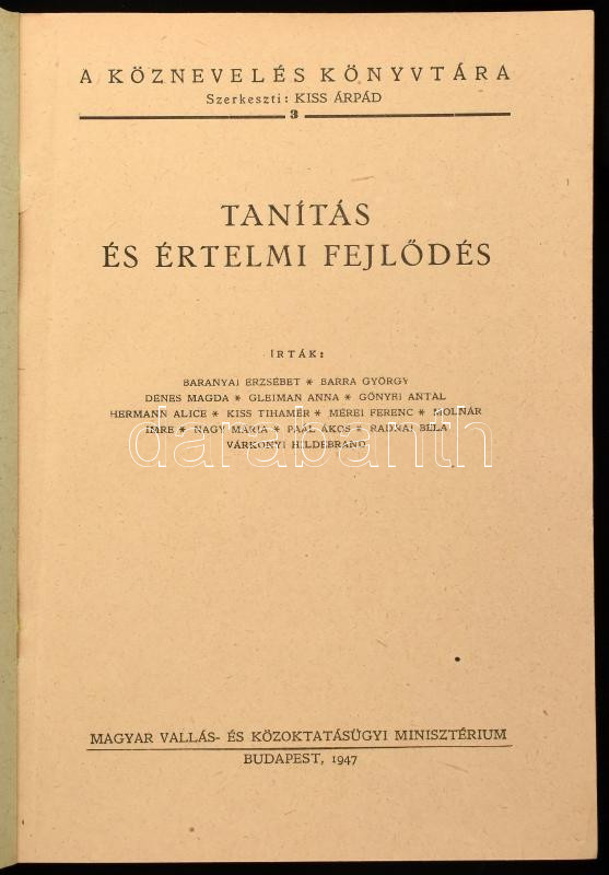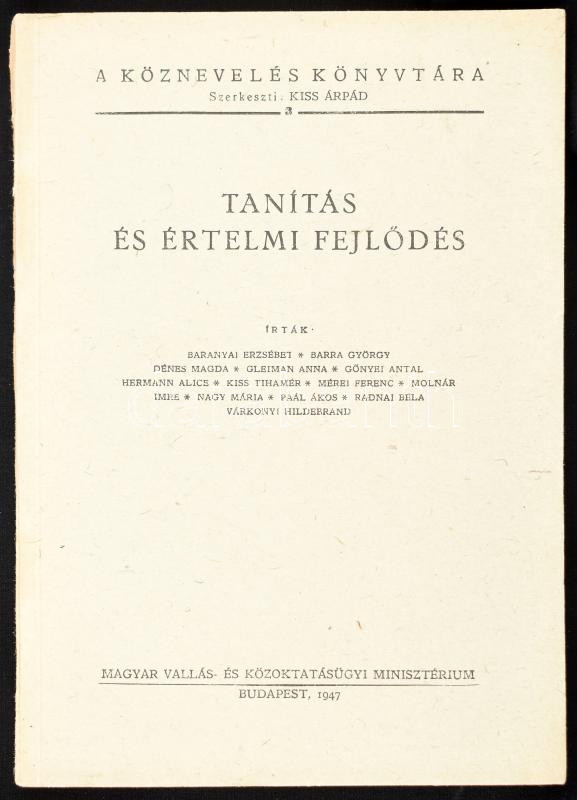 Description: Baranyai Erzsébet et al.: Tanítás és értelmi fejlődés. A Köznevelés Könyvtára 3. Bp., 1947, Magyar Vallás- és Közoktatásügyi Minisztérium, 192+(4) p. Kiadói papírkötés.