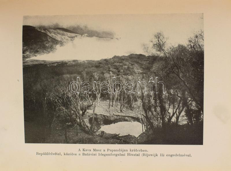 Keöpe Viktor: A szigetek gyöngye. 53 képpel és 2 térképpel. Budapest, (1936). Franklin-Társulat Magyar Irodalmi Intézet és Könyvnyomda. 189 + [3] p. + 20 t. (kétoldalas) + 2 térkép (egy egész oldalas, egy kihajtható). Egyetlen kiadás. Keöpe Viktor (1883-1970) utazó, geográfus, földrajzi író úti beszámolója a holland adminisztráció alatt álló Jáva szigetéről, a sziget klímájáról, domborzatáról, vulkanizmusáról, növénytakarójáról, helyi kultúrájáról és gyarmati közigazgatásáról. Színes néprajzi részletekben gazdag beszámolója markánsan európai nézőpontot rögzít: "A jávai kellemes modorú, engedelmes, alázatos nép, látszik, hogy már nagyon megszokta a szolgaságot. Ha nem a hollandiak volnának uraik, akkor valamelyik bennszülött zsarnokoskodnék rajtuk, s ez még sokkal rosszabb volna. Különben élénkek, vidámak, a holnappal édeskeveset törődnek, azt sem tudják, hány évesek. Olyanok, mint a gyermekek; a hollandi kormány úgy is bánik velük. Hagyják, hogy a saját fajuk vezesse, de az ő irányításuk mellett. A nép imádja az ünnepségeket: a rizsaratás ünnepe, házassági ünnepségek, tűzijátékok, gamelang, táncok... s ha mindez megvan, boldog is." Az előszó oldalán régi ajándékozási bejegyzés. (A Magyar Földrajzi Társaság Könyvtára.) Díszesen aranyozott kiadói egészvászon kötésben. Jó példány.