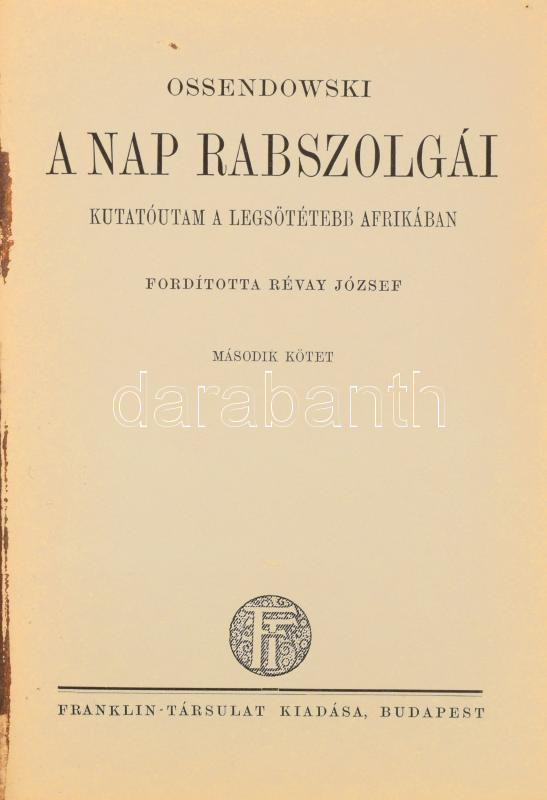 Ossendowski, [Ferdynand Antoni]: A nap rabszolgái. Kutatóutam a legsötétebb Afrikában. Fordította Révay József. I-II. kötet. [Teljes.] Budapest, [1931]. Franklin-Társulat (ny.) 168 p.; 198 + [2] p. Első magyar kiadás. Ferdynand Ossendowski (1876-1945) lengyel geológus, antropológus, földrajzi író, a cári Oroszország börtönviszonyainak, illetve a bolsevik forradalomnak szemtanúja, átélője, szakértője és megörökítője. Nemzetközi hírnevét orosz és szovjet témájú köteteinek köszönheti, melyeket a világ számos nyelvére lefordítottak. A híressé vált szerző a két világháború között számos felfedezőutat tett. Kötetünk a szerző 1926. évi, a Guineai-öböl környékén tett, nyugat-afrikai expedíciójáról való beszámoló, amely emlékezetes képet fest a rabszolgatartást elvileg korlátozó francia uralom, a törzsi kultúra és a modern civilizáció összeütközéseiről. Az úti rajz lengyel eredetije 1928-ban jelent meg. [Modern utazók és felfedezők könyvtára.] Vuray 608. Egységes, aranyozott kiadói egészvászon kötésben. 2. kötet hátsó borítóján kis sérüléssel, egyébként jó állapotban