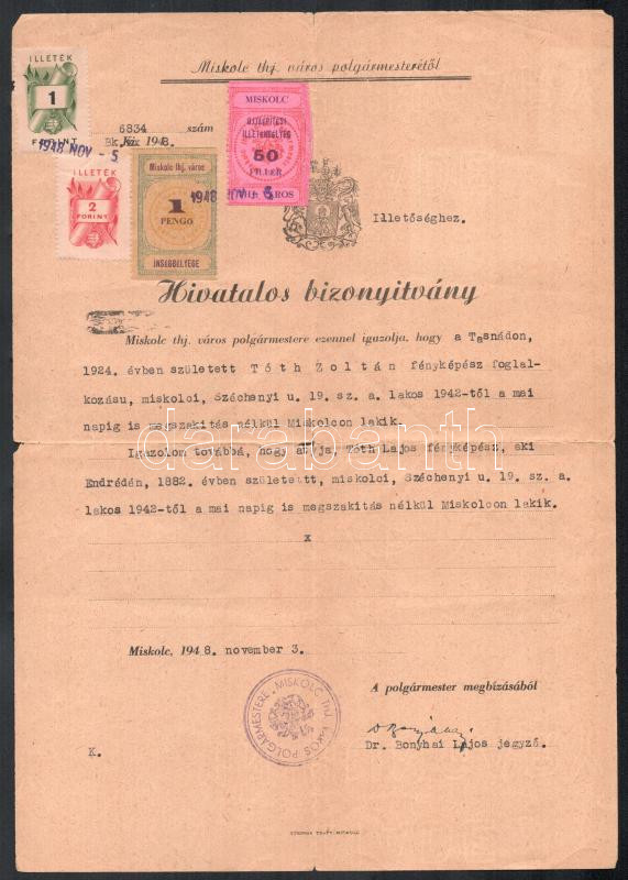 1948 Miskolc, bizonyítvány, különböző bélyegzésekkel (3 Ft illeték + 1...