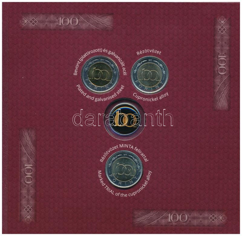 Description: 2019. "Az első rézötvözetű és az utolsó acél bicolor 100Ft-os forgalmi érme " érmeszett, benne 2018. 100Ft "MINTA" jelzéssel, 2019. 100Ft (2xklf) acél és Cu-Ni alapanyagokból T:UNC