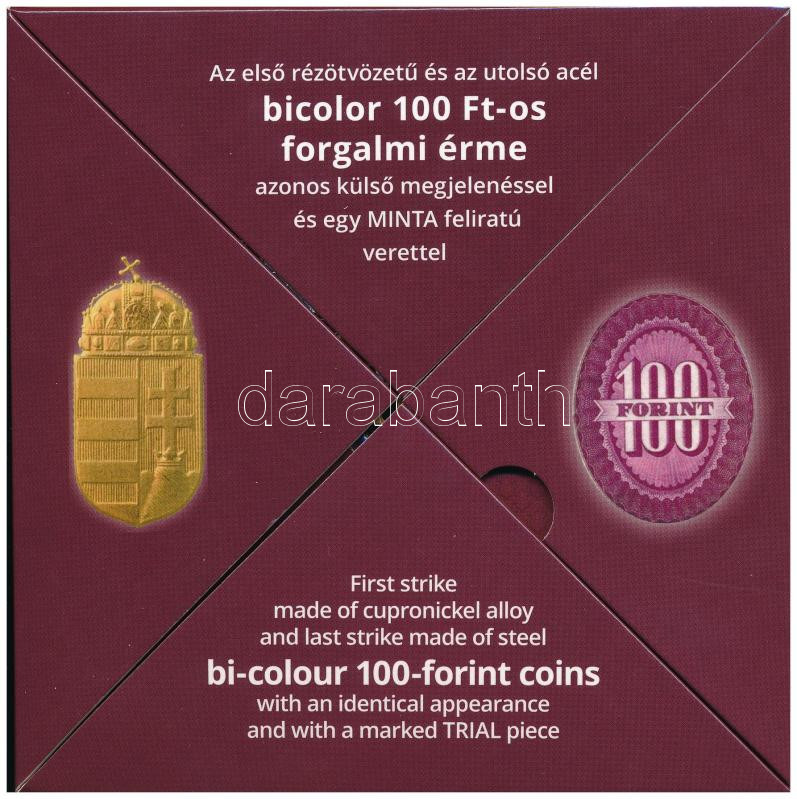 2019. "Az első rézötvözetű és az utolsó acél bicolor 100Ft-os for... https://www.darabanth.com/en/488-Online-auction/488.0/Numismatics/Hungarian-Coin-sets~500023/2019-3Cem3EAz-elso-rezotvozetu-es-az-utolso-acel-bicolor-100Ft-os-forgalmi-erme3Cem3E-erme~II3308882