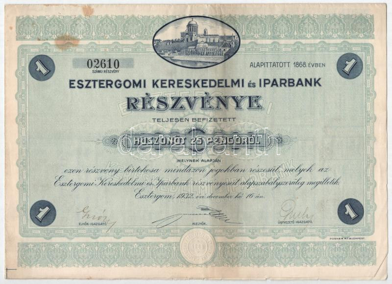 Esztergom 1932. "Esztergomi Kereskedelmi és Iparbank" részvé...