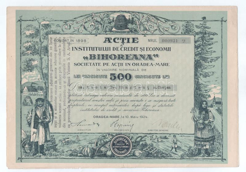 Románia / Nagyvárad 1924. " 'Bihoreana" Hitel- és Takar... https://www.darabanth.com/en/488-Online-auction/488.0/Numismatics/Shares-and-Tickets~500007/Romania-Nagyvarad-1924-Bihoreana-Hitel-es-Takarekintezet-Reszvenytarsasag-Nagyvar~II3350465