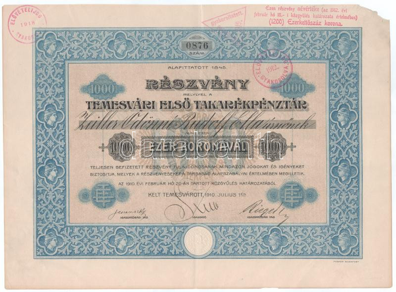 Temesvár 1910. "Temesvári Első Takarékpénztár" névre szóló r... https://www.darabanth.com/en/488-Online-auction/488.0/Numismatics/Shares-and-Tickets~500007/Temesvar-1910-Temesvari-Elso-Takarekpenztar-nevre-szolo-reszvenye-1000K-rol-szarazpe~II3350358