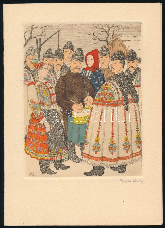 Pekáry István (1905-1981): Társaság. Rézkarc, akvarell, papír. Jelzett. Karácsonyi-újévi üdvözlőlap, 1930-40 körül. 12,5x10 cm