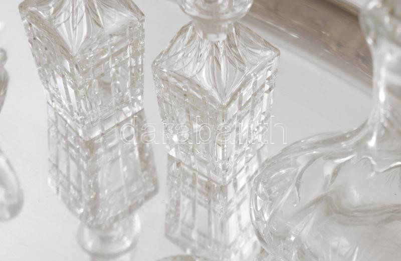 Kínálótálca, rajta 6 darab régi csiszolt üveggel, h: 55 cm