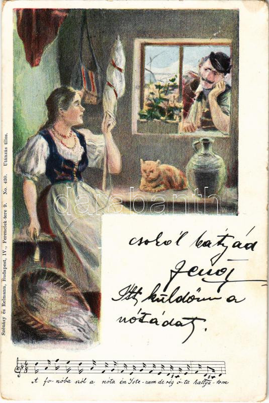 Description: A fonóba szól a nóta, én Istenem de rég óta hallgatom... Magyar folklór művészlap / Hungarian folklore art postcard. Szénásy és Reiman No. 430. (kopott sarkak / worn corners)