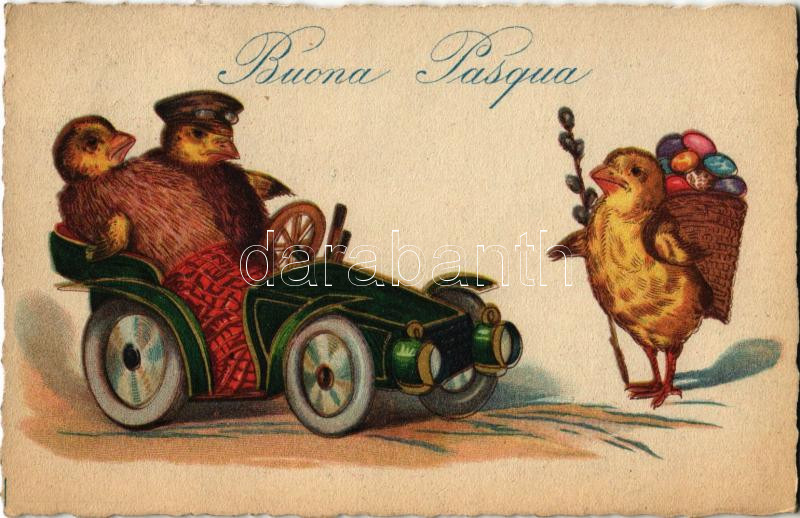 1926 Buona Pasqua / Kellemes Húsvéti Ünnepeket, csirkék autóban / Easter greeting, chicken in automobile. C.C.M. 0043.