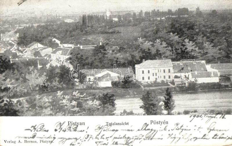 1902 Pöstyén, Pistyan, Piestany; látkép. Kiadja A. Bernas / Totalansicht / general view (kis sarokhiány / small corner shortage)