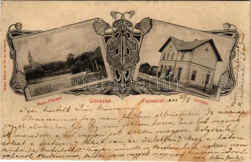 1903 Facset, Facsád, Faget; Román-Facset, Indóház, vasútállomás. Weisz Károly és Társa kiadása / general view, railway station. Art Nouveau, floral (fl)