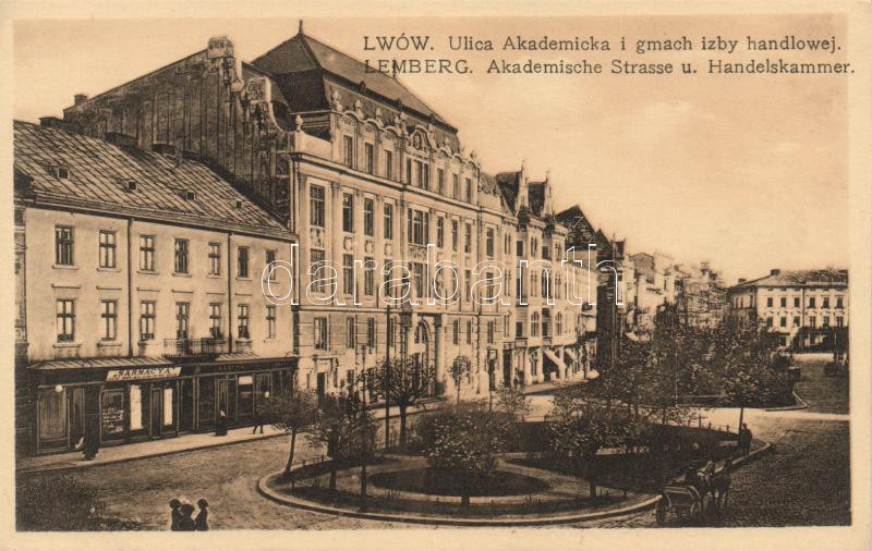 https://www.darabanth.com/en/488-Online-auction/488.0/Postcards/Ukraine~2500100/Lviv-Lwow-Ulica-Akademicka-Akademische-Strasse-Handelskammer~II818176