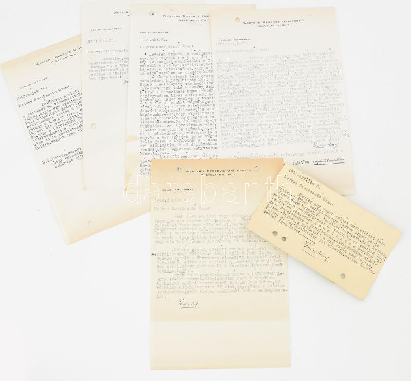 1951-1952 Reményi József (1891-1956) emigráns, amerikai magyar író, irodalomtörténész gépelt levelei (6 db), autográf aláírásokkal, Molnár József (1918-2009) emigráns magyar író, könyvkiadó, nyomdász, folyóirat szerkesztő, az Aurora Kiadó szerkesztője részére.