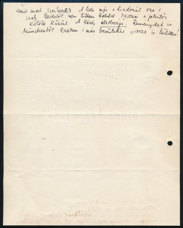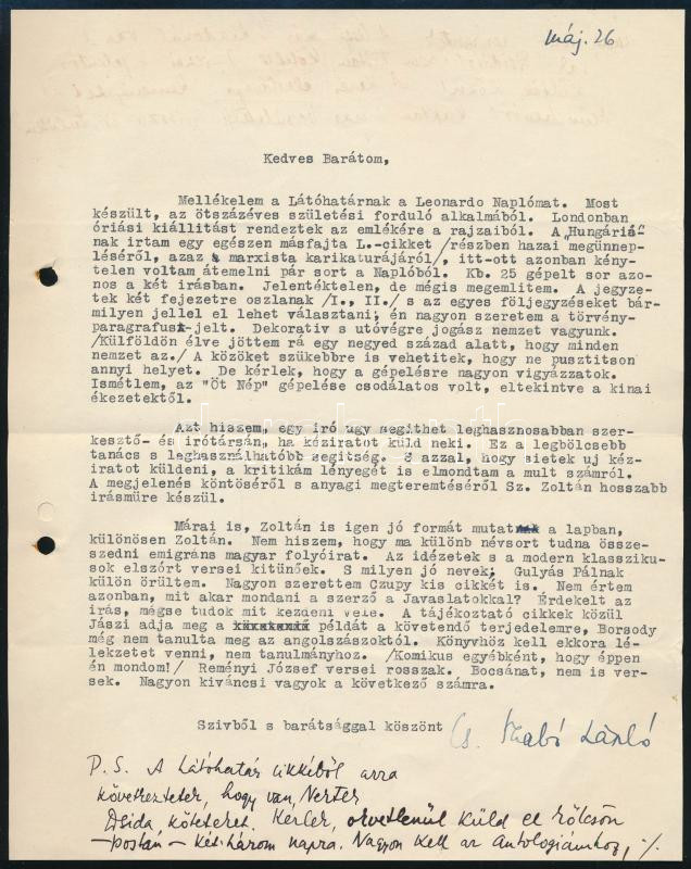 1952 London, Cs. Szabó László (1905-1984) Kossuth-díjas magyar író, esszéíró, kritikus gépelt levele, autográf aláírással és autográf soraival Vámos Imre (1927-1993) író, újságíró, parasztpárti politikus, a Látóhatár című folyóirat alapító szerkesztője, a Szabad Európa Rádió munkatársának részére. Az Új Látóhatárral kapcsolatban, Leonardo emlékévre megküldött írással, valamint benne Máraira vonatkozó sorral.