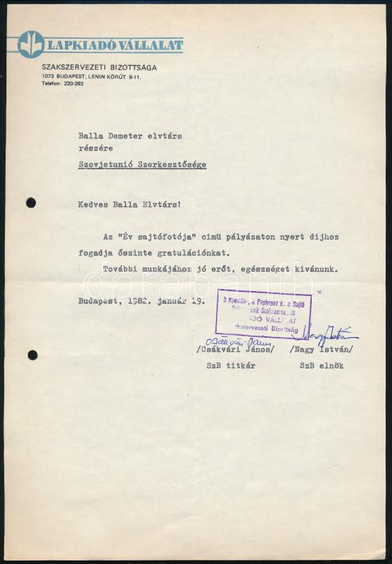 1982 Bp., a Lapkiadó Vállalat Szakszervezeti Bizottságának gratuláló levele Balla Demeter (1931-2017) fotográfus részére "Az év sajtófotója" pályázaton nyert dÃjához, Csákvári János titkár és Nagy István elnök aláÃrásával
