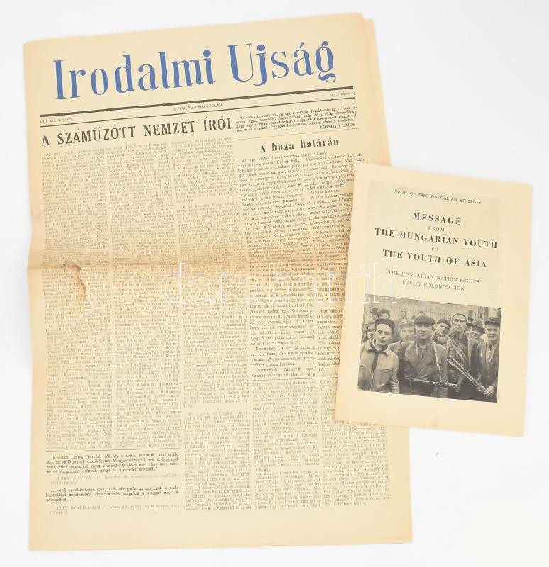 Description: cca 1957-1960 Message from The Hungarian youth to The youth of Asia. The Hungarian nation fights soviet colonization. hn., én., nyn., 15 p. Fekete-fehér fotókkal illusztrált. Papírkötés. + 1957 Irodalmi Újság. VIII. évf. 1. szám. 1957. május 15.
