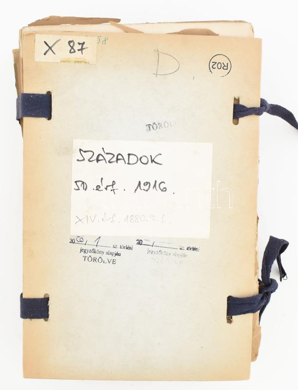 Description: Századok. A Magyar Történelmi Társulat közlönye. Szerk.: Domanovszky Sándor. 1916. évi (L.) évf. 1-10. sz. (Teljes évfolyam). Bp., 1916, Magyar Történelmi Társulat (Athenaeum-ny.) + 1880. évi (XIV.) évf. 9. füzet. Kiadói papírkötés, változó, részben sérült, széteső állapotban.
