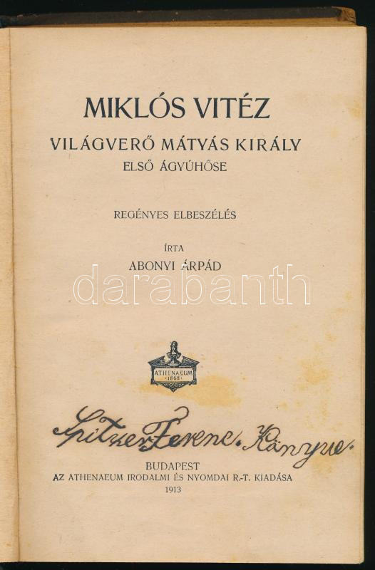 Abonyi Árpád: Miklós vitéz. Világverő Mátyás király első ágyúhőse. Reg... https://www.darabanth.com/en/489-Online-auction/489.0/Books/Books-Other-rarities~2000028/Abonyi-Arpad-Miklos-vitez-Vilagvero-Matyas-kiraly-elso-agyuhose-Regenyes-elbeszelC3~II3023530