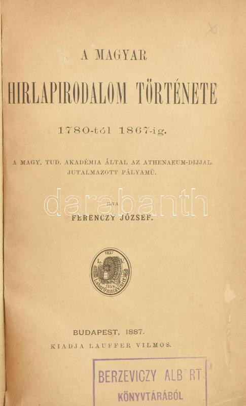 Ferenczy József: A magyar hirlapirodalom története 1780-tól 1867-ig. Bp., 1887, Lauffer Vilmos, VIII+510 p. Átkötött egészvászon-kötésben, néhány ceruzás aláhúzással. "Berzeviczy Albert könyvtárából bélyegzéssel."