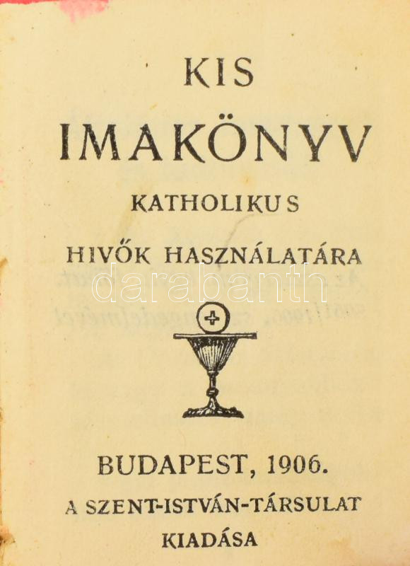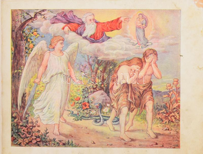 3 darab vallásos témájú könyv. Hock János: Képes Biblia. Az ó- és újszövetség történelme. 50 színes képpel. Bp., 1900., a szerző kiadása (Révai és Salamon-ny.), (4) p.+ 50 t. (színes, litografált táblák). Kiadói aranyozott, szecessziós egészvászon-kötés, Érczhegyi Géza-kötés, kissé kopott borítóval, helyenként kissé sérült, foltos táblákkal. Harmat-Sík: Szent vagy, Uram! Katolikus imakönyv, minikönyv, 1906.