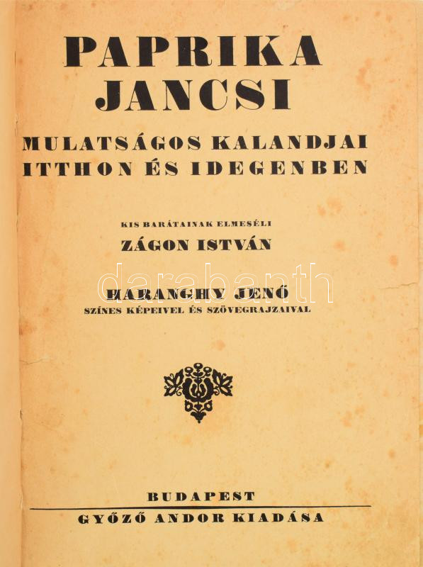 Zágon István: Paprika Jancsi mulatságos kalandjai itthon és idegenben. Kis barátainak elmeséli - -. Haranghy Jenő színes képeivel és szövegrajzaival. Bp., [1936], Győző Andor, 163 p.+ 7 t. Első kiadás. Átkötött félvászon-kötés, kopott borítóval, foltos, szakadt lapokkal, egy tábla és egy lap sérült, részben hiányos, egy lap javított, rossz állapotban.