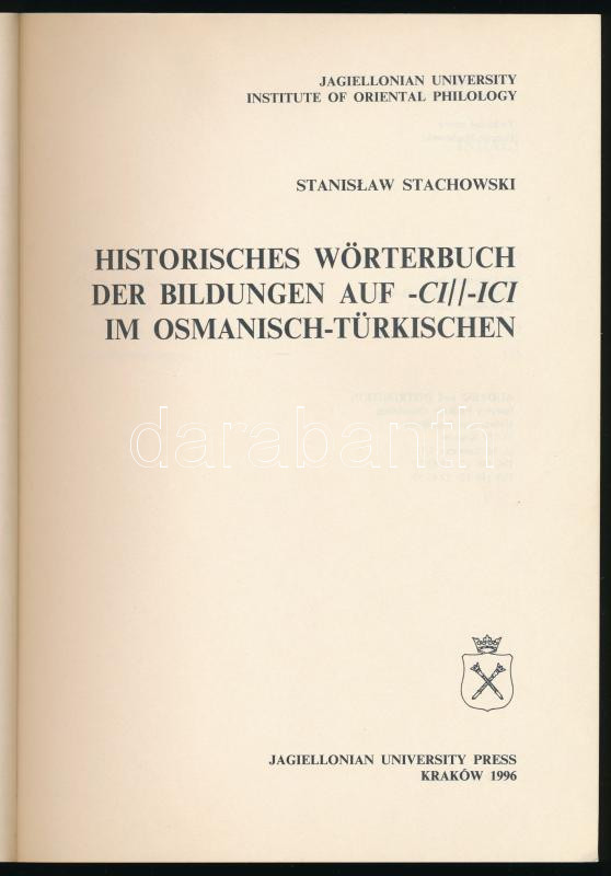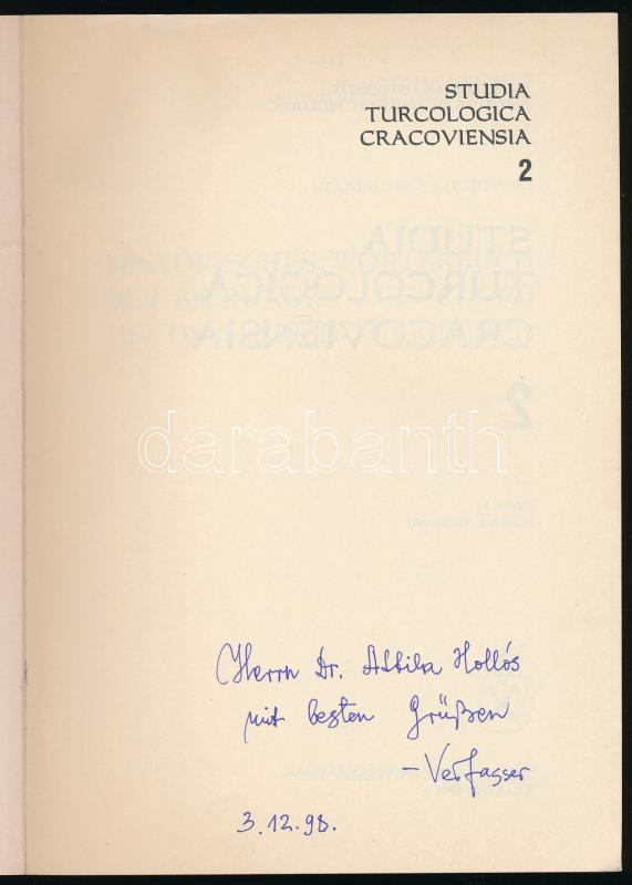 Stanisław Stachowski: Historisches Wörterbuch der Bildungen auf -ci // -ici im Osmanisch-Türkischen. Studia Turcologica Cracoviensia 2. (Dedikált!) Kraków, 1996, Jagellonian University Press. Kiadói papírkötés. Az előzéklapon a szerző, Stanisław Stachowski (1930-2021) szlavista, turkológus, nyelvész, lexikográfus német nyelvű dedikációjával Hollós Attila szlavista nyelvész részére. / Signed by the author, Stanisław Stachowski (1930-2021).