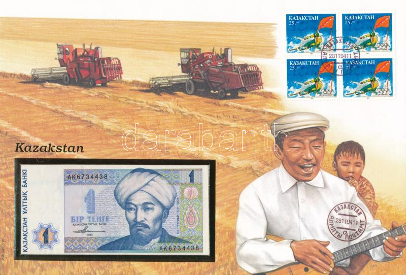 Kazahsztán 1993. 1T felbélyegzett borítékban, bélyegzéssel T:UNC Kazakhstan 1993. 1 Tenge in envelope with stamp and cancellation C:UNC