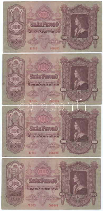 1930. 100P (7x) mind "E 355" sorozat, közeli sorszámok és eg...