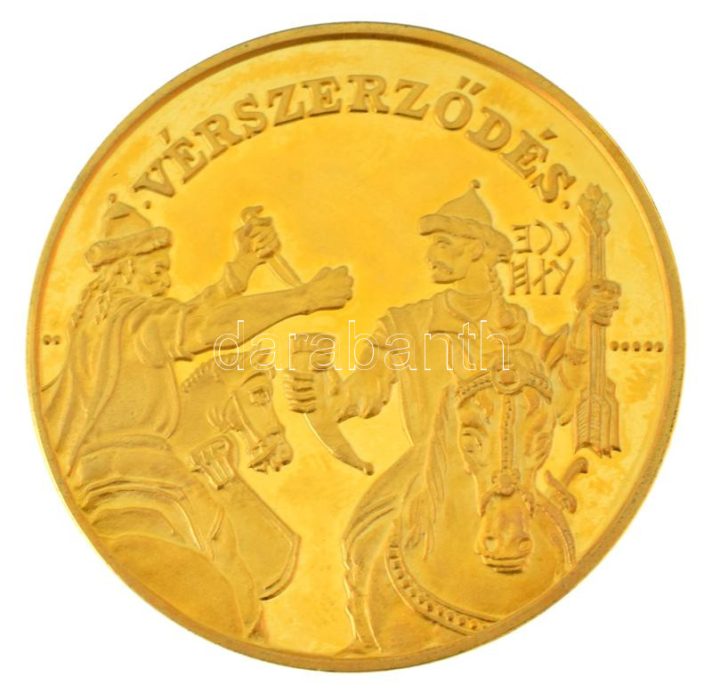 Lebó Ferenc (1960-) 1996. "A Honfoglalás emlékére 896-1896 / Vérszerződés" aranyozott Cu emlékérem kapszulában (42,5mm) T:AU (eredetileg PP) folt