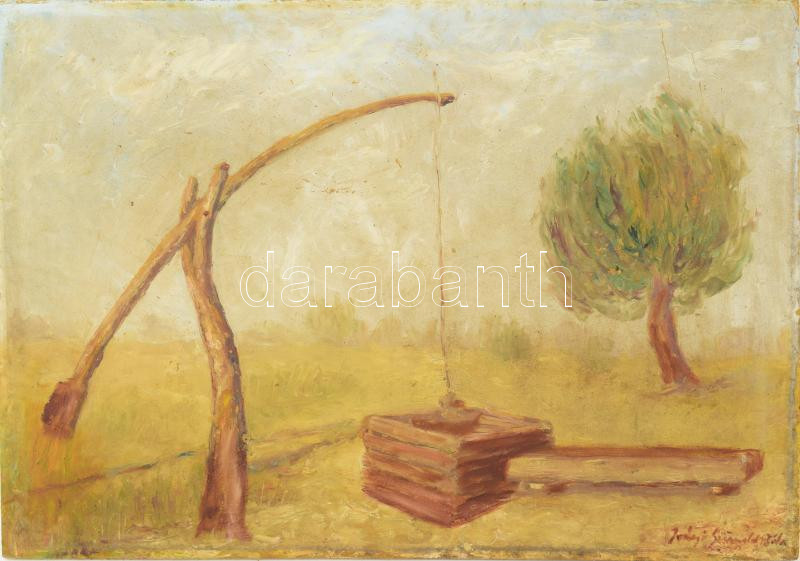 Iványi Grünwald Béla jelzéssel: Gémeskút. Olaj, farost. Kissé sérült. ...