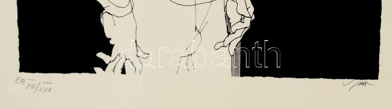 Description: Szász Endre (1926-2003): Illusztráció Négysoros vershez, melyet Villon halálítélete szélére írt Szitanyomat, papír, jelzett, művészpéldány EA XIII/XXV számozással. Hátoldalán Faludy György autográf aláírásával. Az 1996-ban megjelent Francois Villon balladái Faludy György átköltésében c. mappából. 41x29 cm. Üvegezett fakeretben.