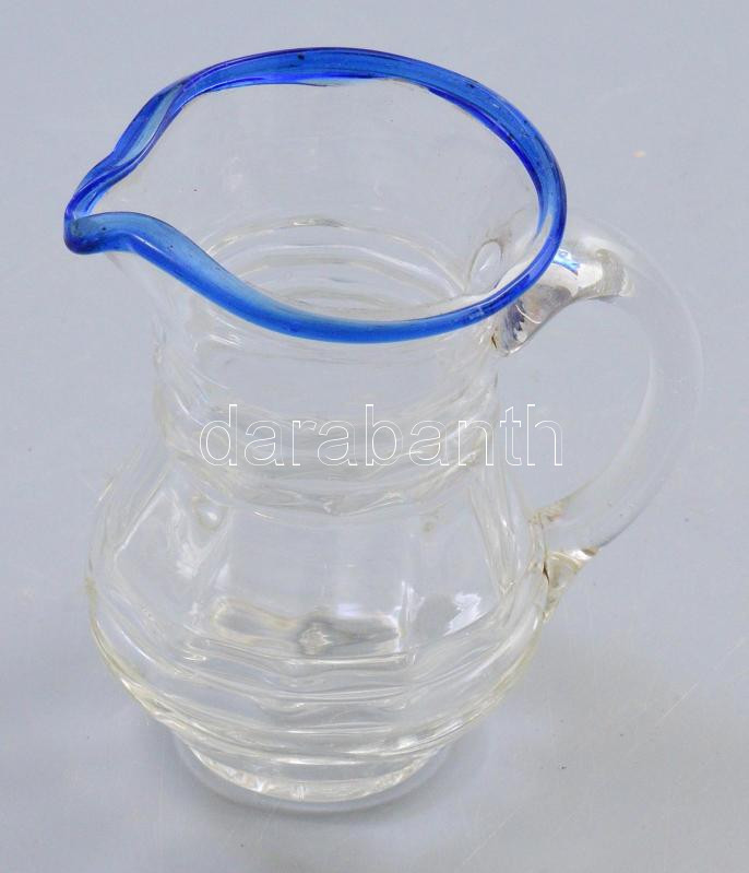 Kancsó. cca 19. vége, Feketeerdő, színtelen hutaüveg, pereménél kéküveg díszítéssel, lepattanással, m: 9,5 cm