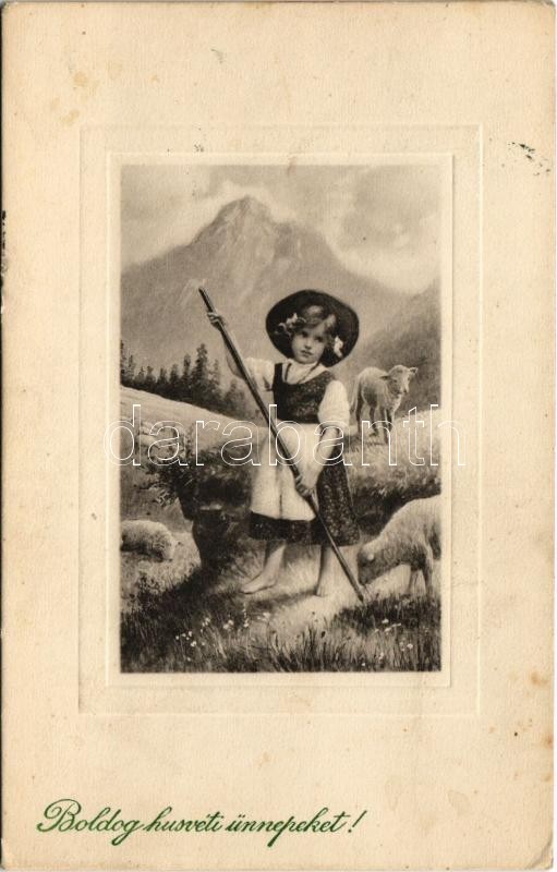 1912 Boldog húsvéti ünnepeket / Easter greeting art postcard with girl and sheep. P.T.L. Art de Vienne No. 2173. (fl)