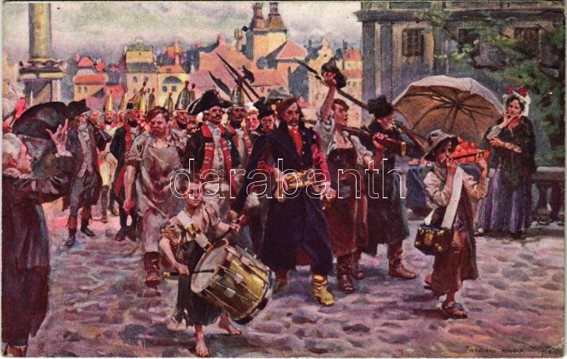 Description: Kilinski prowadzi jenców moskiewskich do Warszawy / Polish military art postcard. Kilinski leads Moscow POWs (prisoners of war) to Warsaw s: W. Kossak (EK)