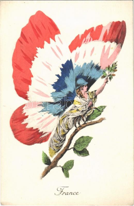 Description: France. Editions "Aux Alliés" Paris, Helio L. Géligné No. 16. / Allies of World War I (Entente Powers): France. Art Nouveau butterfly lady / Antanthatalmak az első világháborúban: Franciaország. Szecessziós pillangó hölgy